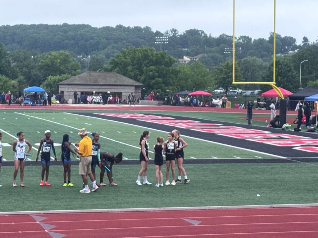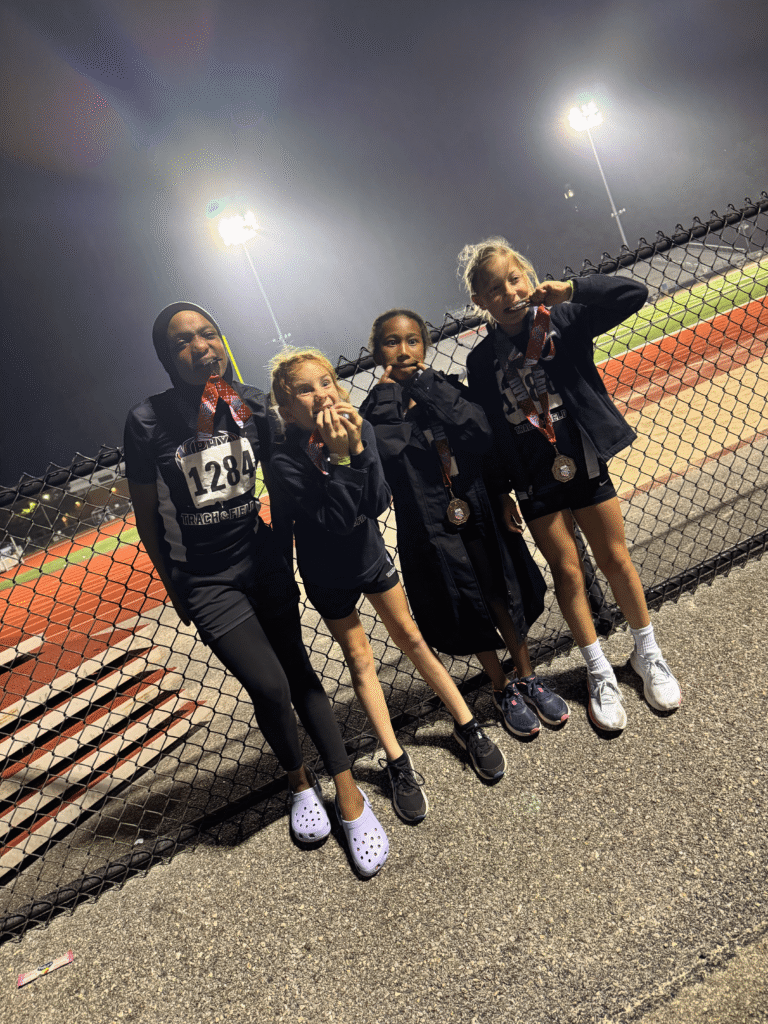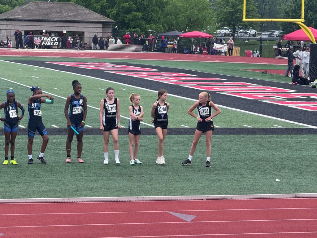 Girls 12 years old – Isla Sillup broke her own team and age group record in the 400 meters running 1:05.71 to place 5th. Isla also ran a 1:05.25 split on the 3rd place 4×400 relay. Mya Shoemaker reset her own age group record in the 100 meters running 14.19 in the 100 meters placing 9th. Mya also ran a 1:08.46 split in the 4×400 relay and anchored the bronze medal 4×100 relay! Ellie Schaible placed 4th in the 3000 meters, 10th in the 1500 meters, 12th in the 800 meters with a PR of 2:53.79 to advance in all three events. Clarie Kline placed 7th in the 1500 meters with a PR of 6:03.45 and 15th in the 800 meters to advance in both events. Sarah Harmdierks placed 14th in the 100 meters, was part of the bronze medal 4×100 relay, and the 3rd place 4×400. Brooke Irons placed 16th in the 100 meters to advance to the Regional Meet. She also was part of the bronze medal 4×100 relay along with Regan Reilly who also ran the 100 and 200. Annalise Delp took nearly 9 seconds off of her previous PR in the 800 running 3:01.41 to finish 16th and advance to the Regional Meet. Note that despite the team of Isla Sillup, Sarah Harmdeirks, Maggie Shaner, and Mya Showmaker placing 3rd place in the 4×400 with a time of 4:38.29 they will not advance to the Regional Meet due to an obscure ruling about our girls cheering on their teammates, but that does not diminish their outstanding accomplishment.